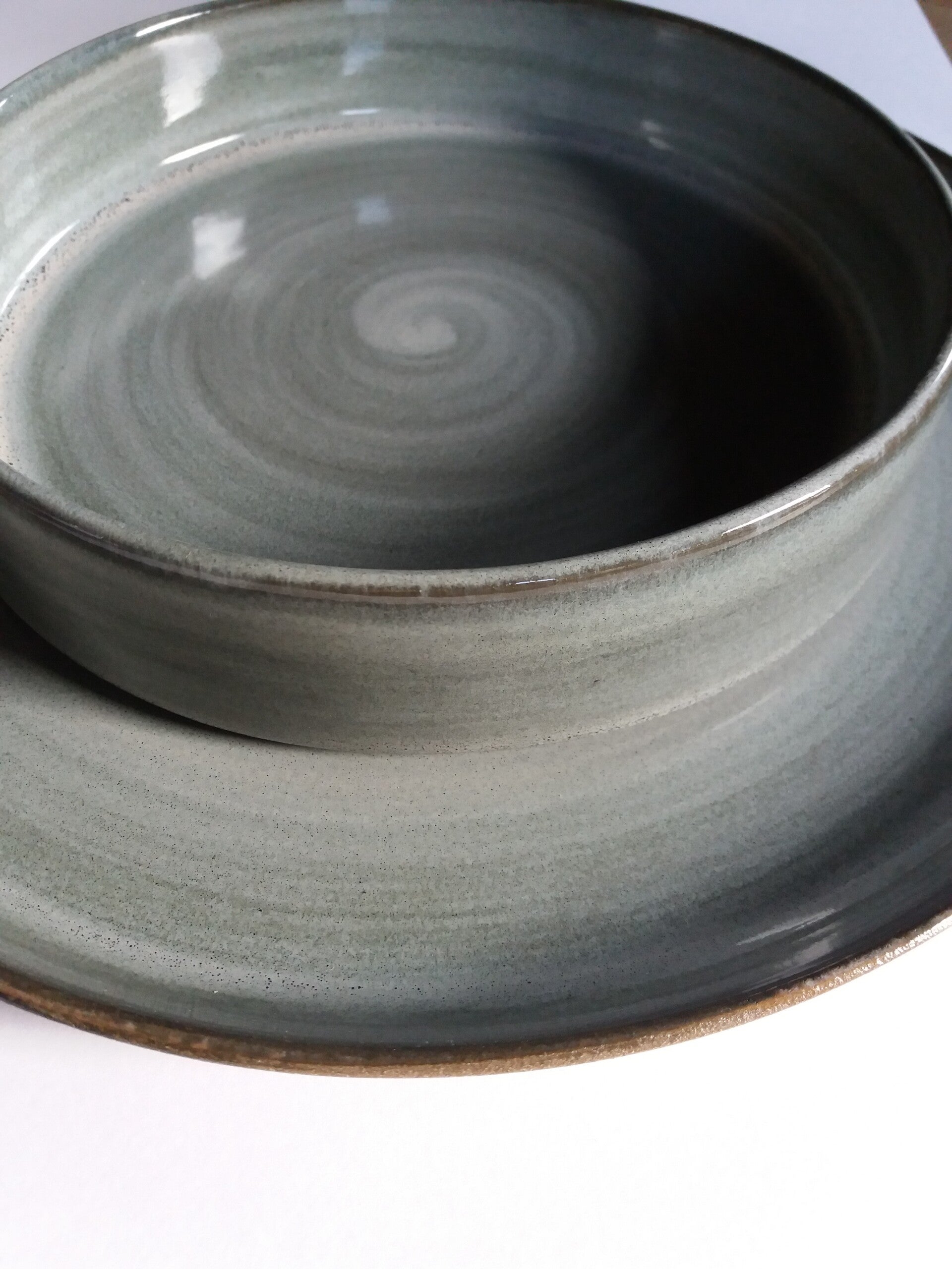 Deze set bestaat uit een lage bowl en een bord. De bowl kan gebruikt worden voor ontbijtgranen maar ook voor een voorgerechtje of een dessert. Het kan evenzeer dienen voor een éénpersoonsportie rijst, frietjes of aardappelen, of voor een slaatje. Ieder stuk is met de hand gemaakt zodat er minieme verschillen kunnen optreden. De glazuren die ik gebruik zijn niet-giftig en voedselveilig. U kan alles in de vaatwasmachine zetten maar handwas wordt aangeraden. De bodem van elk stuk is glad geschuurd zodat er geen krassen op uw meubels komen.